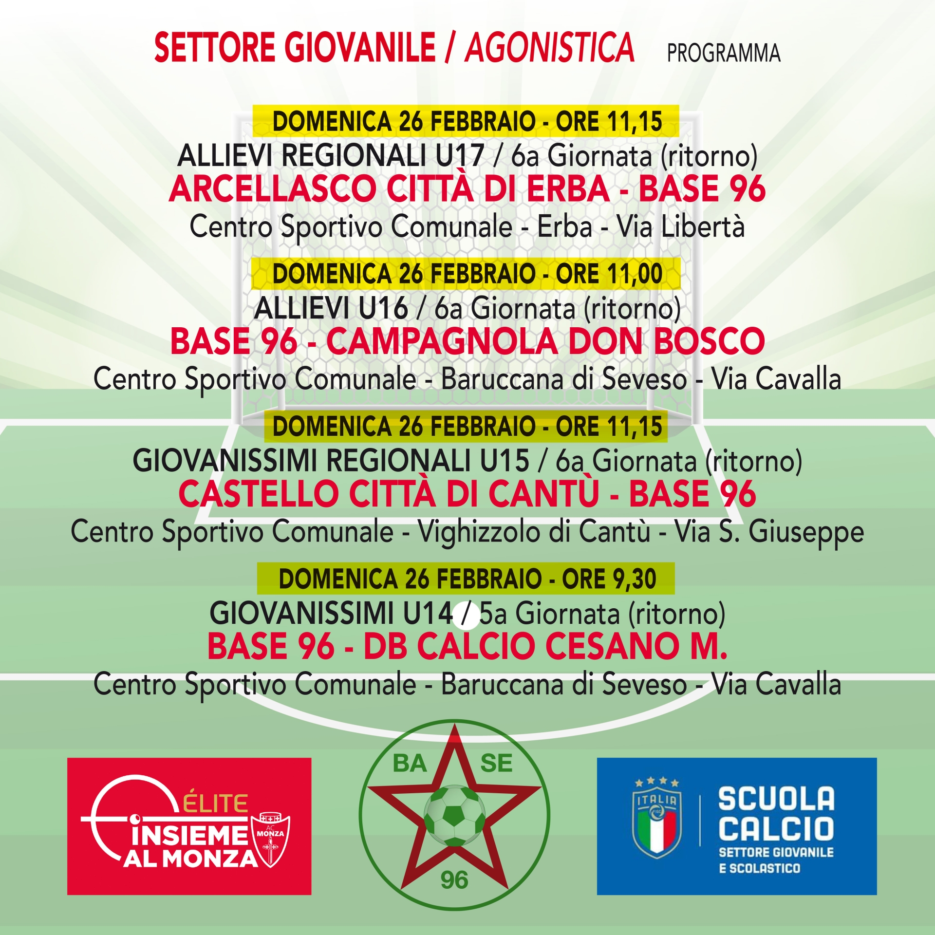 Gli ALLIEVI REGIONALI U17, affronteranno i pari età dell' ARCELLASCO CITTà DI ERBA in trasferta alle ore 11,15. Gli ALLIEVI U16 giocheranno contro il CAMPAGNOLA DON BOSCO in casa alle ore 11,00.