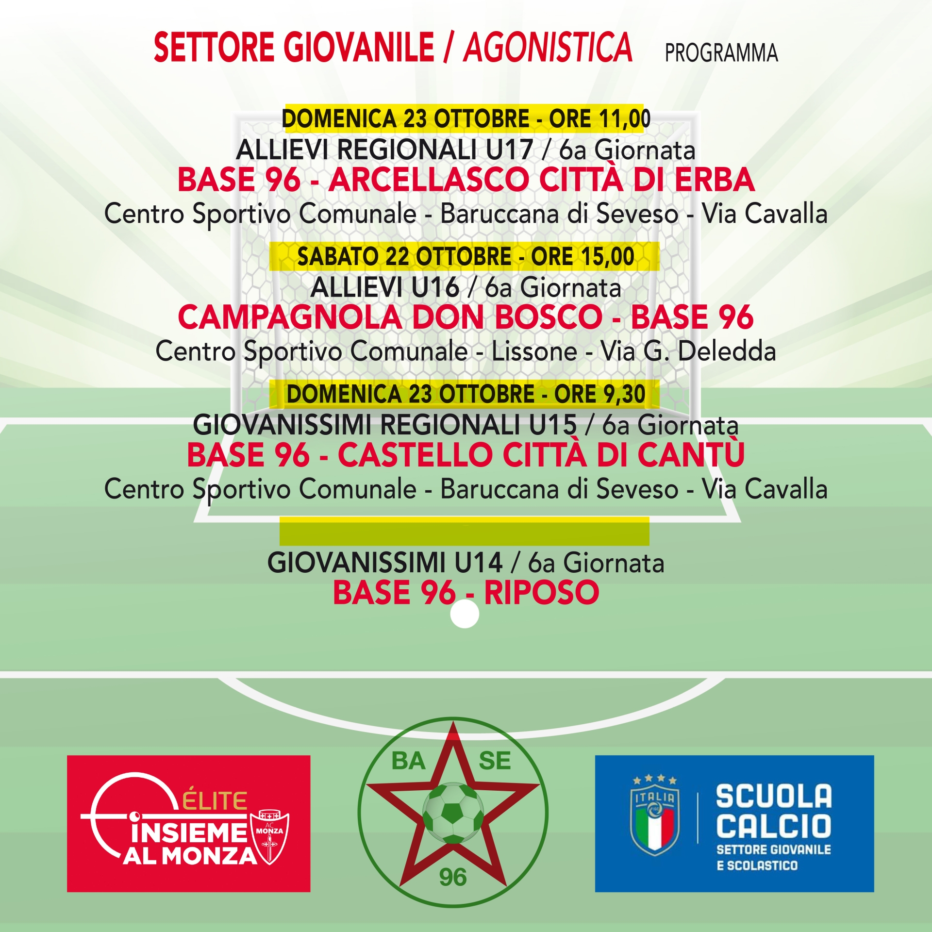 Le nostre due squadre “Regionali” giocheranno in casa domenica mattina, gli ALLIEVI U17 REGIONALI sfideranno l'ARCELLASCO alle ore 11, prima di loro i GIOVANISSIMI U15 REGIONALI saranno impegnati per mantenere il vertice della classifica vs il CASTELLO CITTà DI CANTù alle ore 9,30.